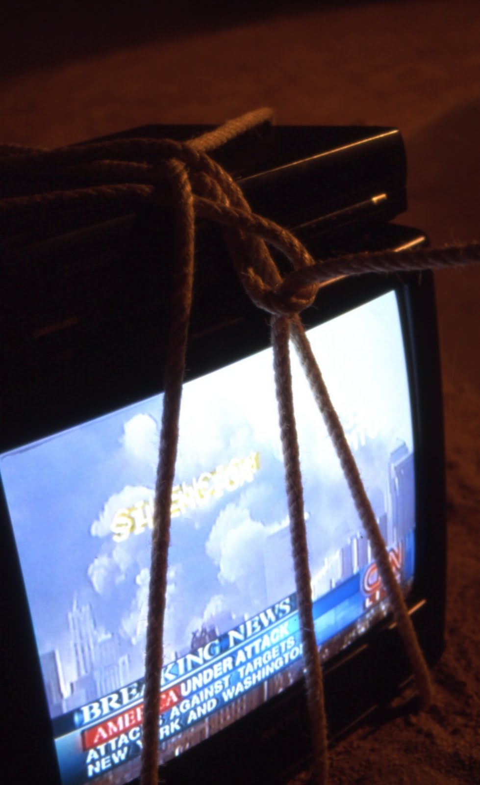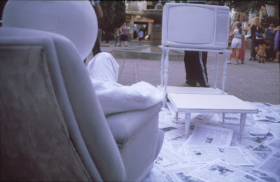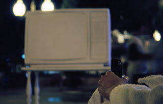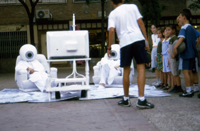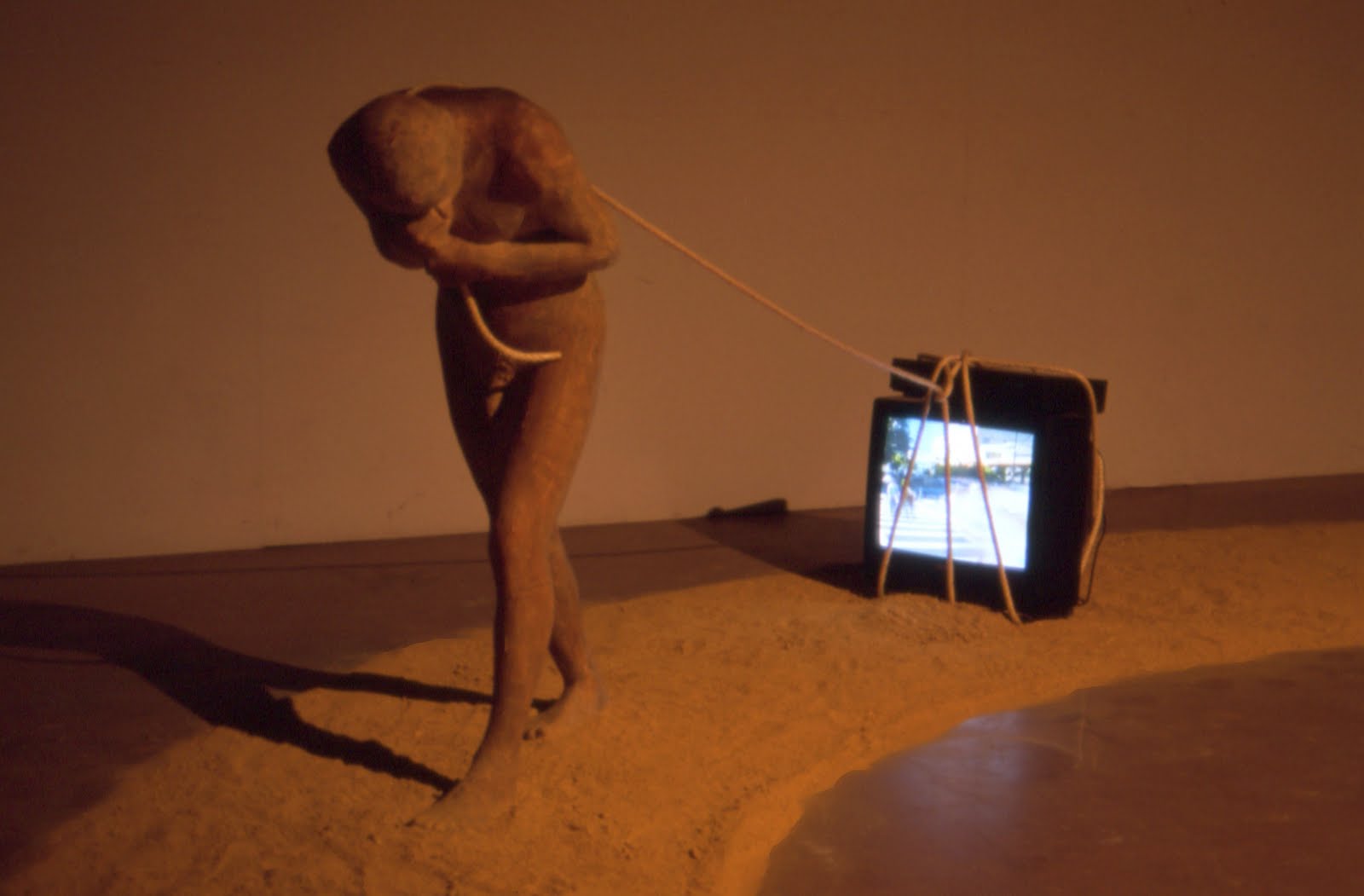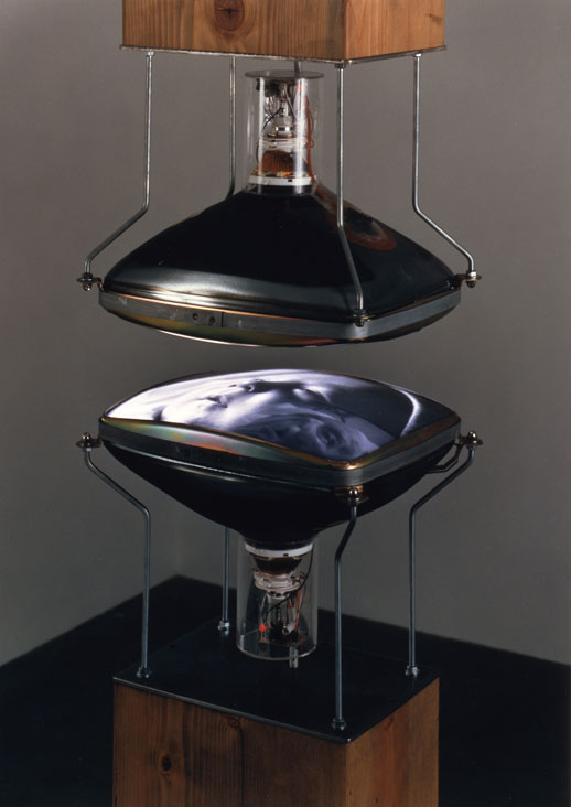 No se trata sólo de sacar físicamente la tele de su marco de referencia, sino de convertir el objeto que produce la imagen en metáfora de sí mismo que conversa con su propia imagen