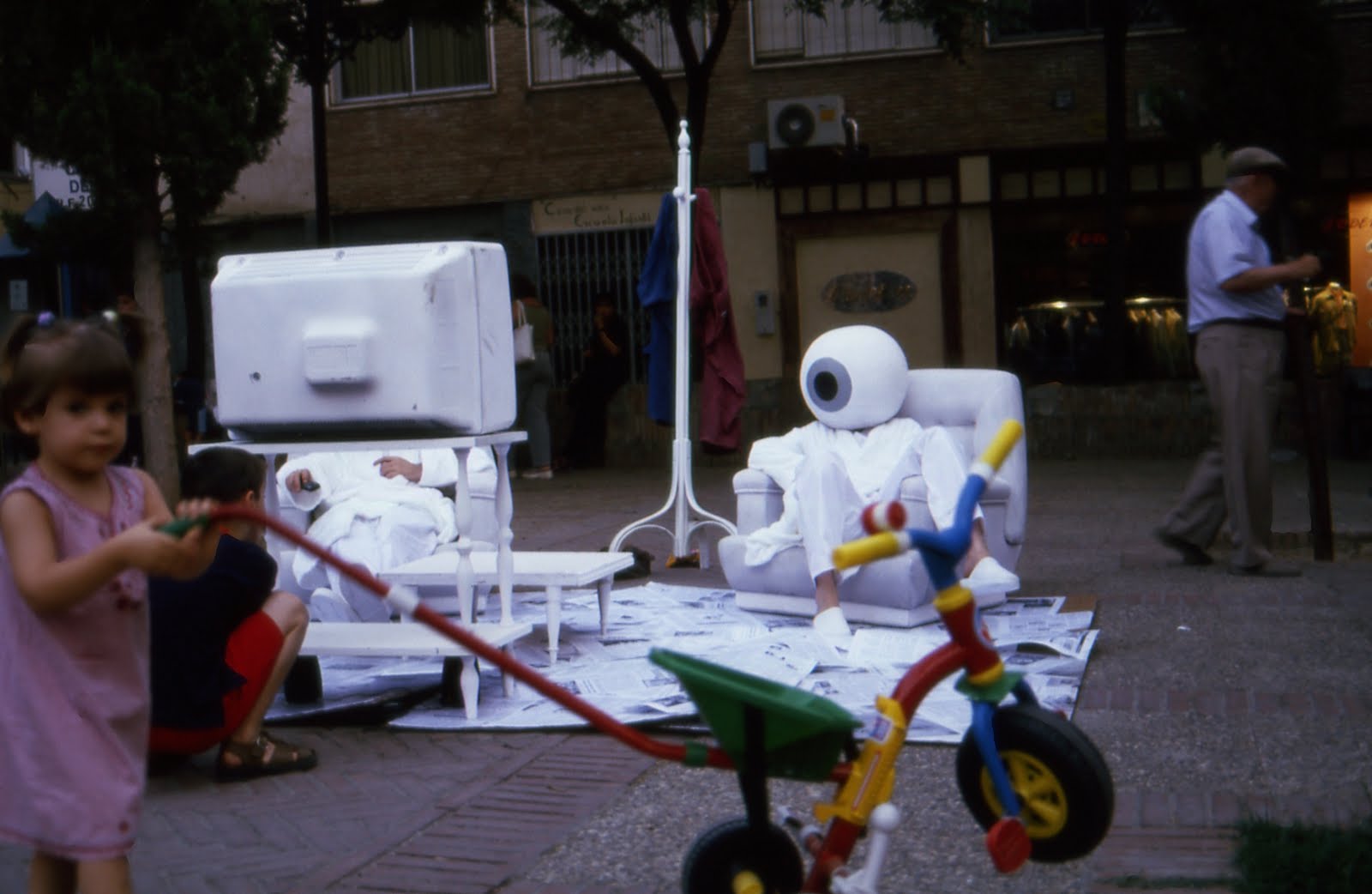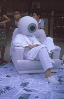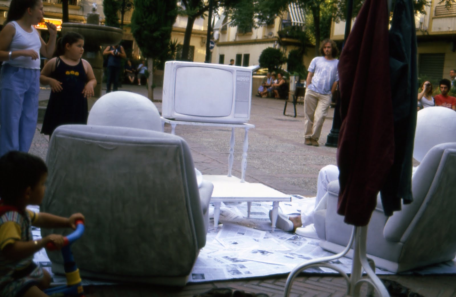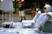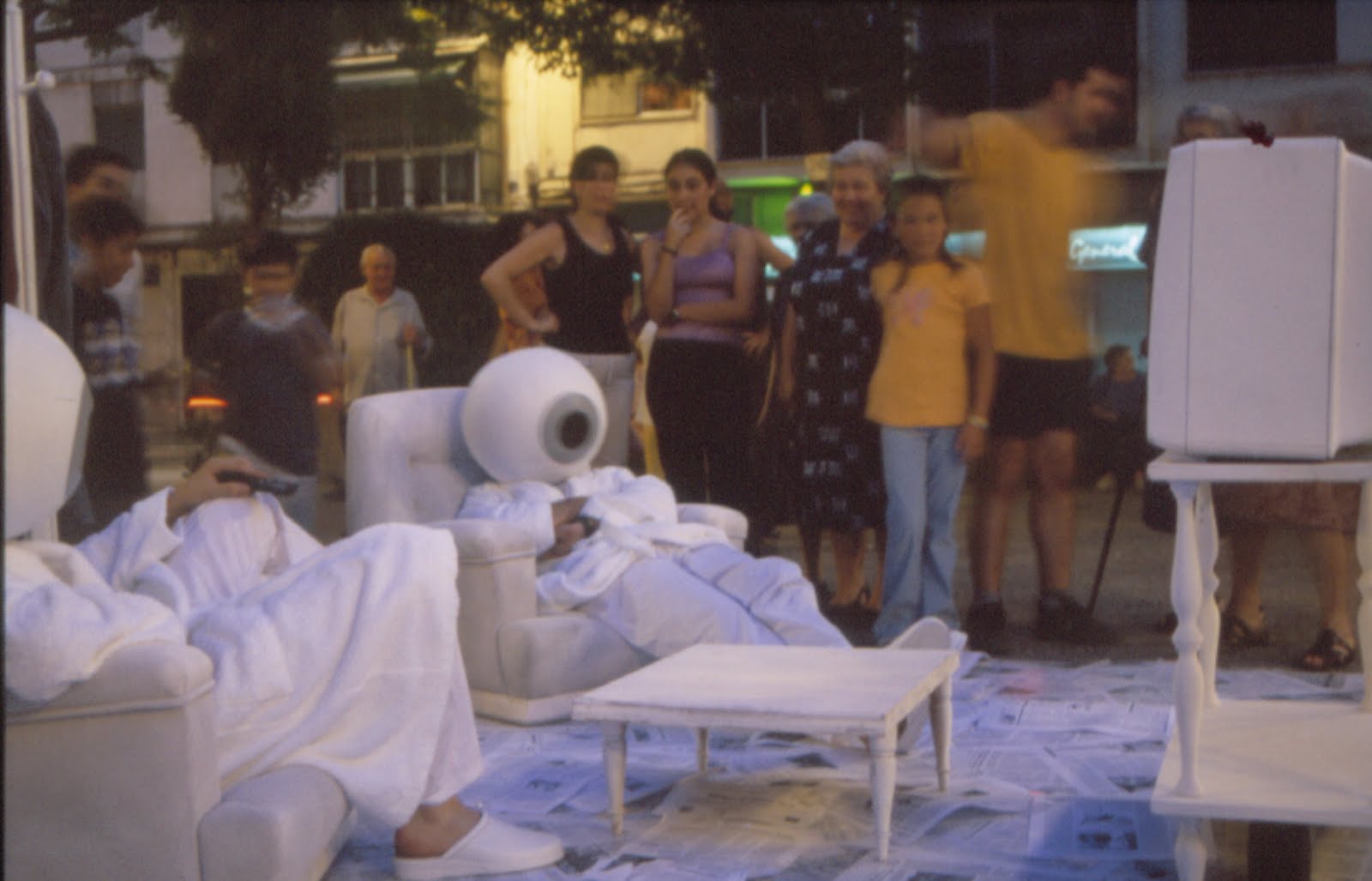 No se trata sólo de sacar físicamente la tele de su marco de referencia, sino de convertir el objeto que produce la imagen en metáfora de sí mismo que conversa con su propia imagen