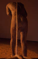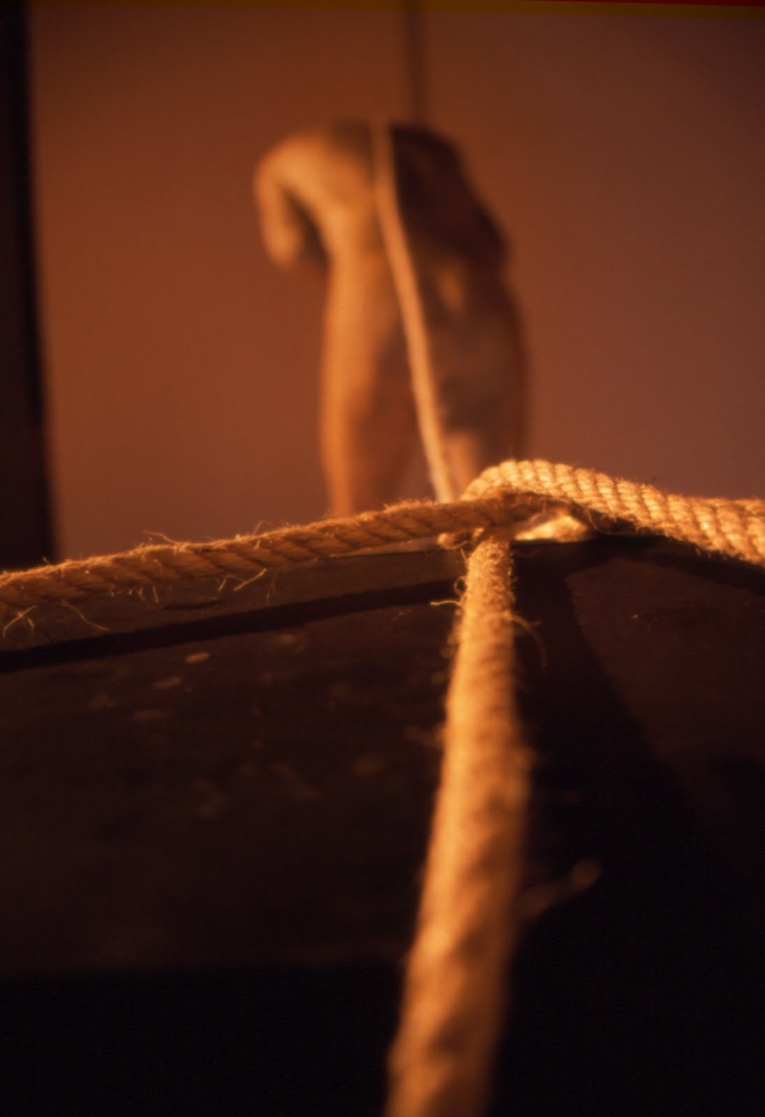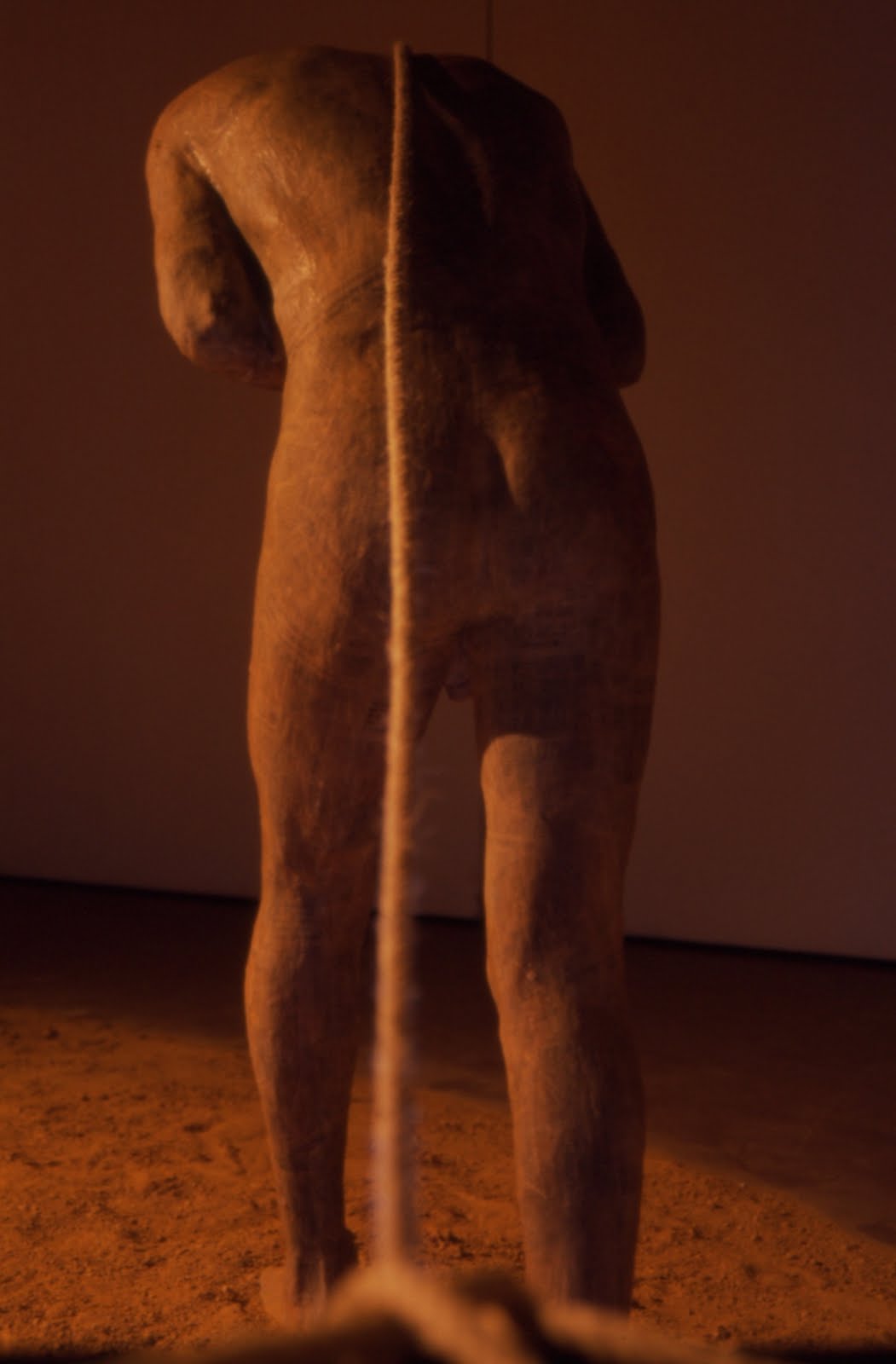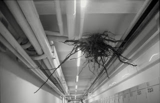La raíz, como ya sabemos se encuentra en el pasillo del sótano del edificio, además también está desubicada, se encuentra colgada del techo, al descubierto, en un medio que no es la tierra. Pero..., no sólo la raíz está desubicada, también lo está el tronco y la copa. La descontextualización del árbol en general, ubicado en un espacio ajeno a su medio natural, creo que ha sido un buen recurso para provocar el efecto deseado. Es evidente el descolocamiento que nos produce un objeto en un entorno extraño a su origen, cuando menos, nos inquieta, nos confunde, nos hace dudar, es decir, hacernos preguntas.