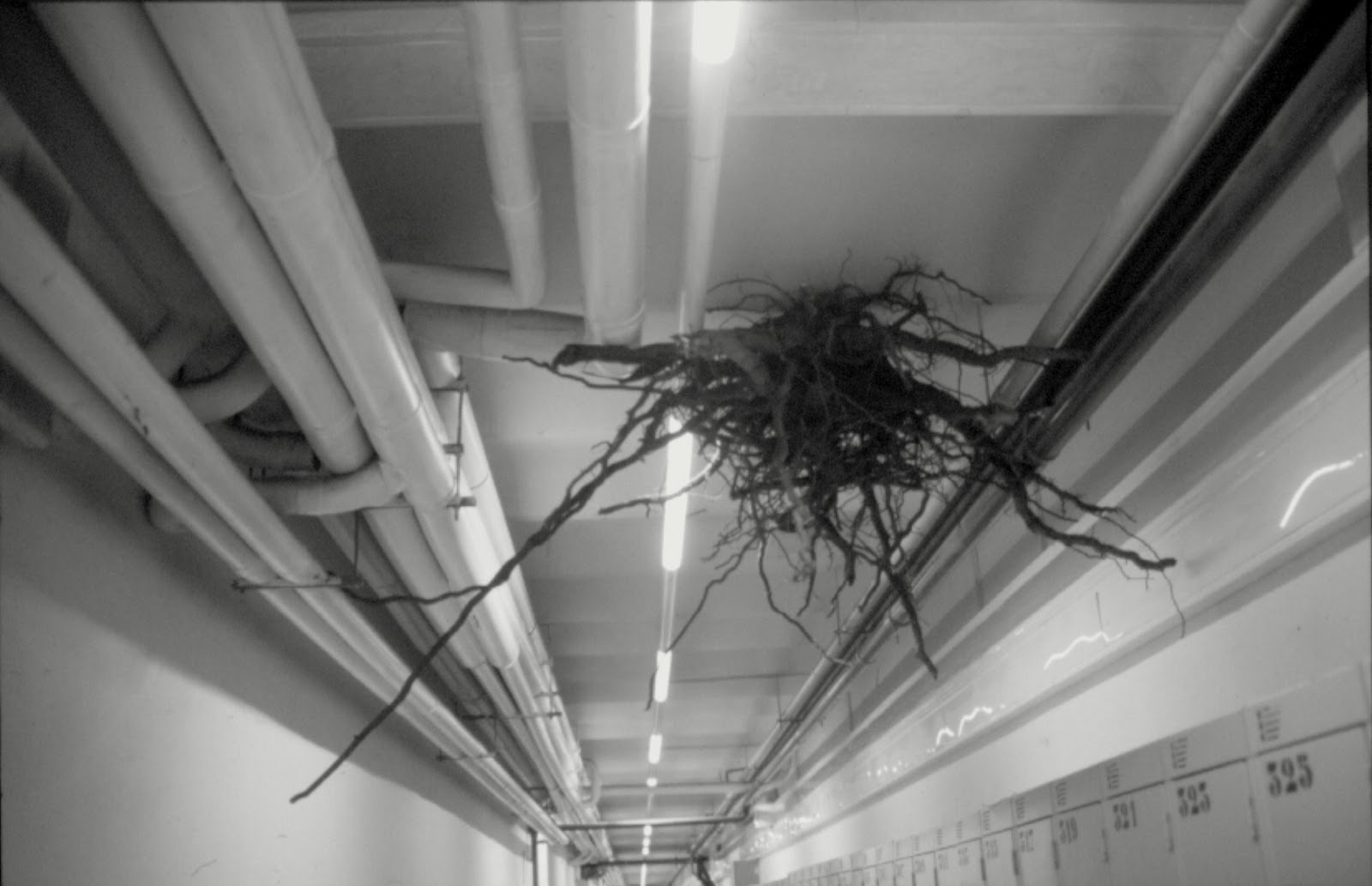 En el pasillo de la planta sótano pendiendo del techo, entre tuberías, canalizaciones y demás elementos que recorren y caracterizan el pasillo se emplaza la raíz al descubierto.