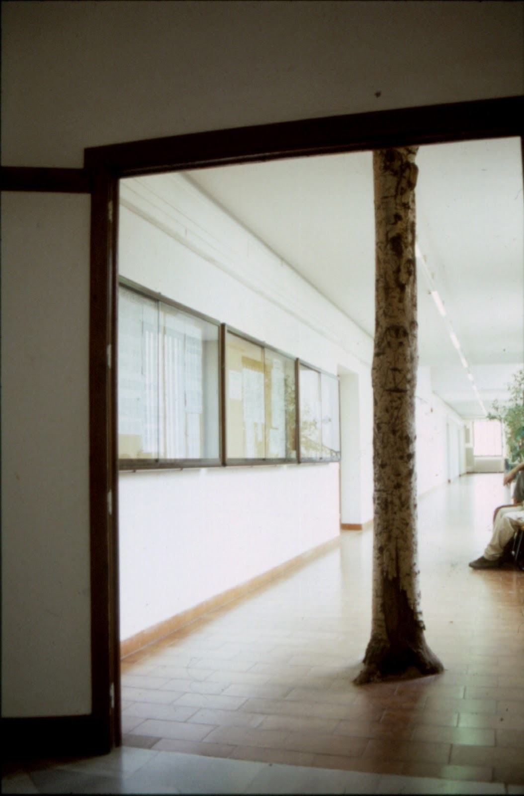 En torno al tronco se organiza toda la facultad, el decanato, la conserjería, secretaría, la entrada y la salida, dibujo, pintura y escultura, es la espina dorsal que sostiene una institución que aunque nos pese no deja de ser fría junto a la presencia de un tronco de árbol des-ubicado, convertido en símbolo mágico, en un tótem.